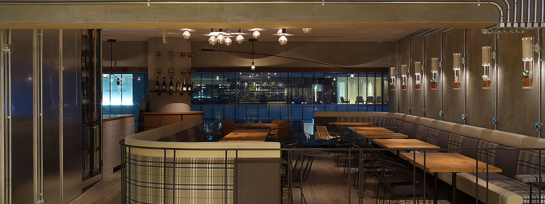 開放的で広々としたテーブル席、梅田の夜景が一望できるソファー席。